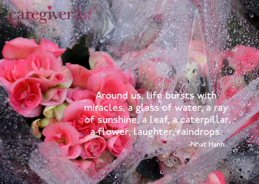 Around us, life bursts with miracles, a glass of water, a ray of sunshine, a leaf, a caterpillar, a flower, laughter, raindrops.