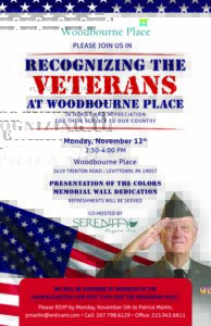 Serenity Hospice Care was proud to co-sponsor a beautiful Veterans Day event at The Woodbourne Place, a Senior Living Community in Levittown PA. Joined by commander David Pearl from the John Billington VFW Post 6497 and the Pennsbury High School ROTC, a fitting tribute and appreciation ceremony was performed for all members of the community. American war veterans residing at Woodbourne Place were recognized for their service and a Veterans Memorial Wall was unveiled and dedicated at this event.